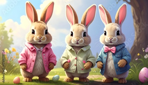 © Songo, Obraz premium Three anthropomorphic rabbits dressed in jackets posing outdoors