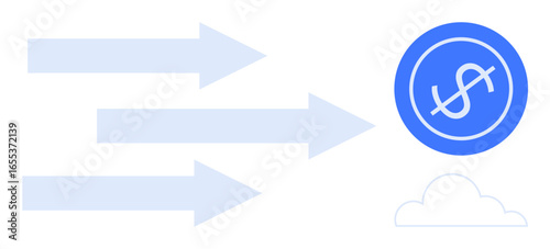 Obraz premium Three arrows point towards a dollar coin and cloud, symbolizing financial growth, digital transactions, progress, cloud computing, efficiency, wealth creation, business innovation. A clean flat