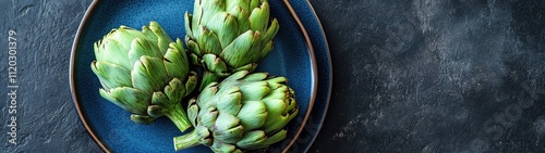 © Taman Siswo, Fototapeta premium Three artichokes on a blue plate. (2)