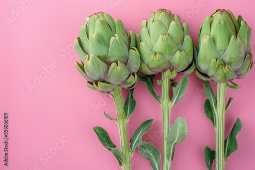 © Sandu, Obraz premium Three Artichokes on Pink Background