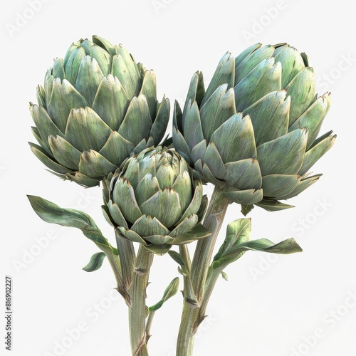 © Arisctur, Obraz premium Three artichokes placed on a plain white background