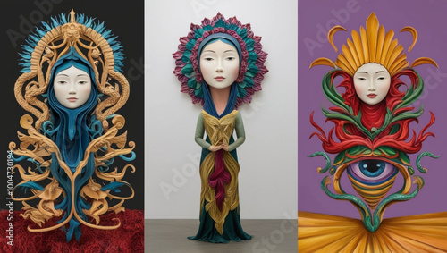 © Wahyu, Fototapeta premium Three artistic statues in the shape of female faces with a unique and symbolic design style