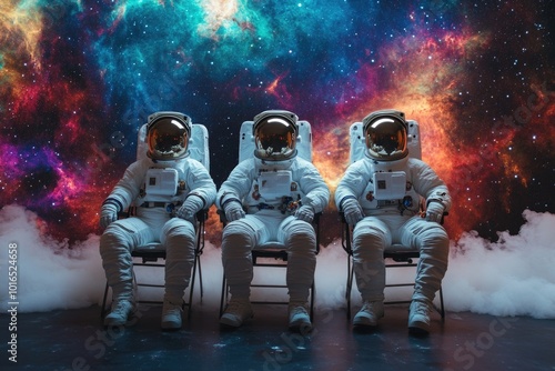 Fototapeta premium Three astronauts seated in front of a colorful background, ideal for use in...