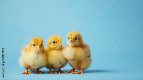 © Boomanoid, Fototapeta premium Three baby chicks on blue background