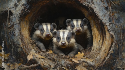 Fototapeta premium Three badgers peeking out from a tree hollow, showcasing wildlife in a...