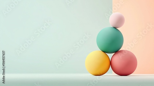 © Anna, Fototapeta premium Three balls on top of each other, against a pink-green wall with a pastel backdrop