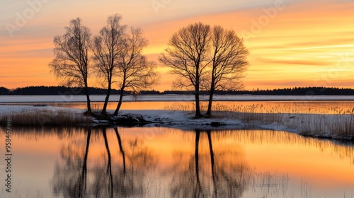 © Paul, Obraz premium Three bare trees reflecting in a calm lake during a colorful winter sunset - AI Generated Digital Art.