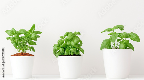 © Kate, Fototapeta premium Three basil plants in white pots sit against a neutral background