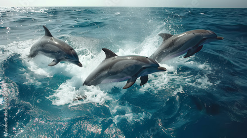 Fototapeta premium Three beautiful dolphins jump out of the sea water at the same time