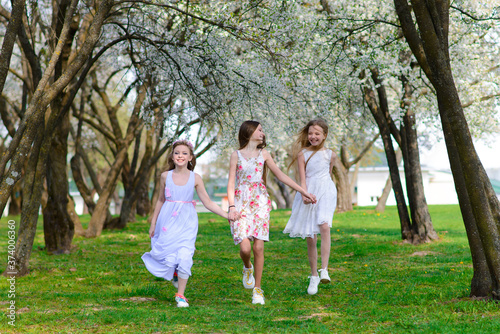 © Ivan Zelenin, Obraz premium Three beautiful girls in retro dresses for a walk in a flowered garden. The idea and concept of a friendly family and a happy childhood.