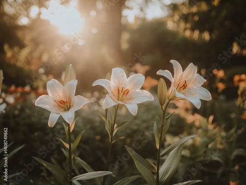 © Ant, Fototapeta premium Three beautiful white lilies bloom in a sunlit garden, surrounded by lush greenery and soft glowing light, creating a serene and peaceful atmosphere.