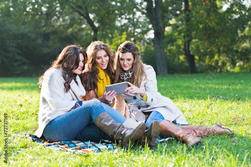 © Tijana, Fototapeta premium Three beautiful women using a tablet in the park