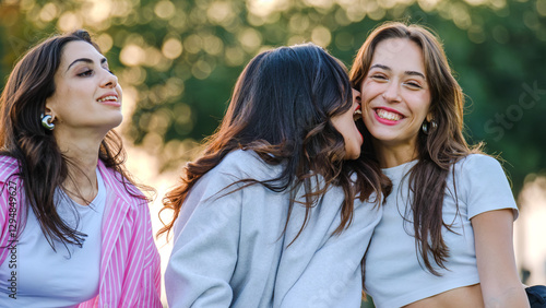 Obraz premium Three beautiful young women posing for the camera on a sunny day in a tree-filled park