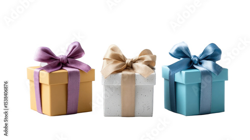 Obraz premium Three beautifully wrapped gift boxes in vibrant colors with elegant bows, isolated on a clean background