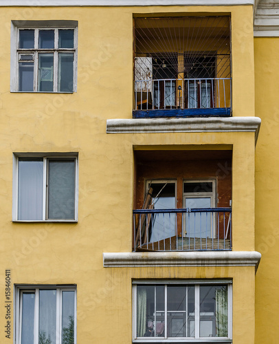 © Maksim, Fototapeta premium Three big balconies on yellow wall with windows