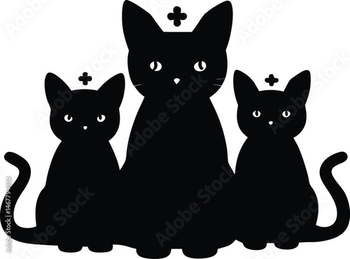 © hamiduls11arts, Fototapeta premium Three black cat silhouettes each with a plus symbol on their head