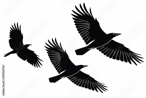 Obraz premium Three black crows silhouettes flying on white background dark birds illustration