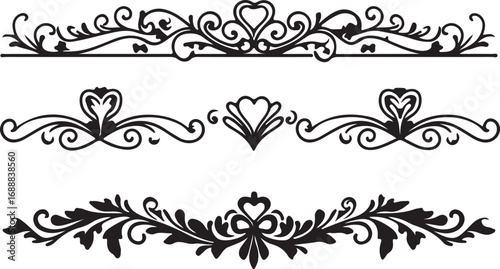 Naklejka premium Three Black Decorative Flourish and Scrollwork Elements with Heart Motifs on...