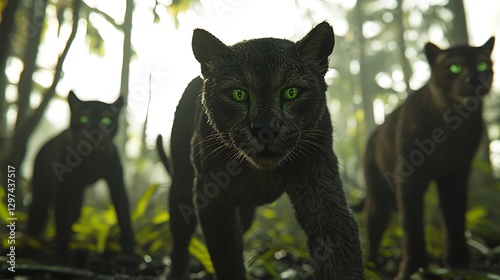 © novri, Obraz premium Three Black Panthers Prowling Through a Lush Forest
