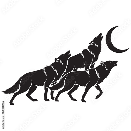 © Zulfa, Fototapeta premium Three Black Wolf Silhouettes Howling at a Crescent Moon on a White Background