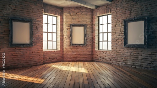 © Kartik, Obraz premium Three blank frame in brick loft room