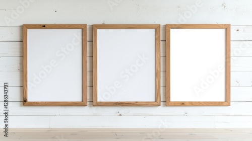 © MAKASIHMAS SIDNEY, Fototapeta premium Three blank frames on wooden wall mockup