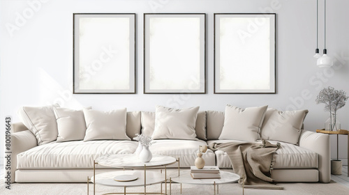 © Olya Fedorova, Fototapeta premium Three blank white posters in the room above the sofa