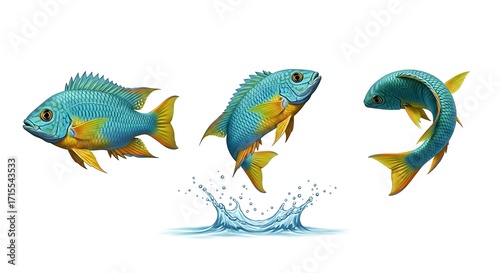 © Sri, Fototapeta premium Three Blue and Yellow Fish Leaping from Water Illustration.