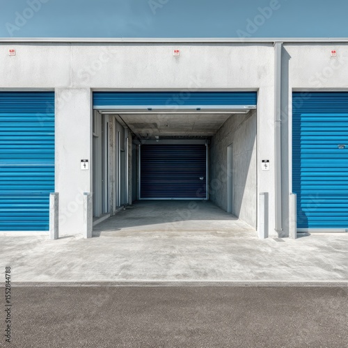 © reno, Fototapeta premium Three blue-doored storage units, concrete building, bright sunlight, open center unit revealing a dark interior, clean asphalt foreground