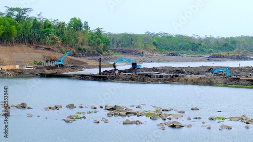 © Adnan, Fototapeta premium Three blue excavator working in construction site in big river