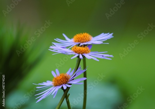 © Girts, Obraz premium three blue flowers with yellow stamens close-up on a green background