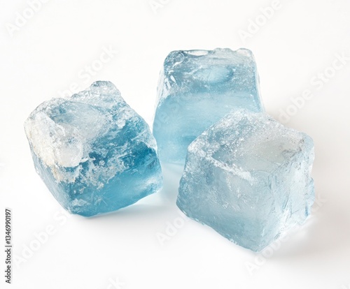 © El Media, Obraz premium Three Blue Ice Cubes on White Background for Refreshing Drinks