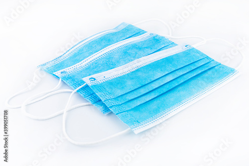 Fototapeta premium Three blue surgical masks for personal protection against the virus, isolated on a white background.