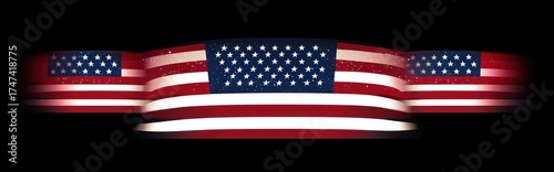 © bright, Naklejka premium Three blurred and moving representations of the United States flag with stars and stripes floating on a black background evoking motion and patriotism