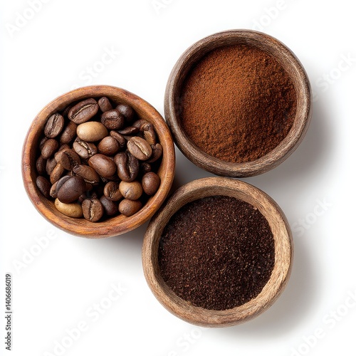 © Goody ART, Fototapeta premium Three Bowls of Coffee Beans and Ground Coffee on White Background