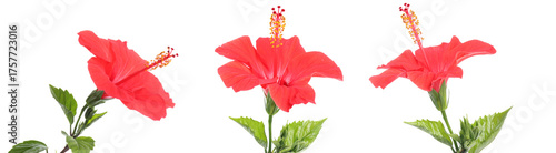 Fototapeta premium Three bright red hibiscus flowers isolated on white, set
