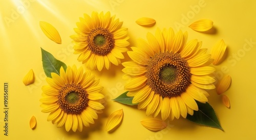 © fitri, Obraz premium Three bright sunflowers with petals and leaves on a solid yellow background, sunny