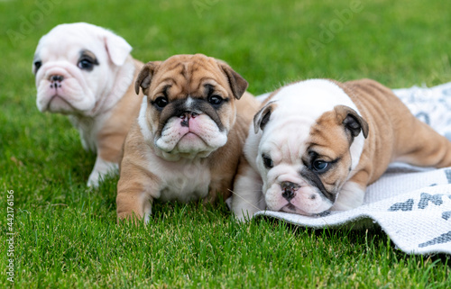 © feeferlump, Fototapeta premium Three bulldog siblings playing outside