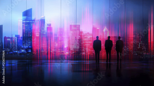 Fototapeta premium Three business professionals silhouetted against vibrant city skyline, showcasing blend of modern architecture and colorful lights