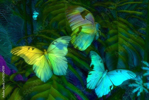 © WETDREAM, Naklejka premium Three butterflies are flying in a lush green forest