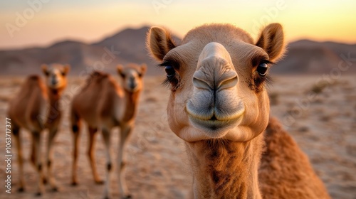 © Dulemegapixel, Obraz premium Three camels travel together across the expansive desert, silhouetted against a breathtaking sunset, epitomizing the beauty of nature, unity, and timeless adventure.