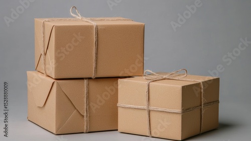 © An, Obraz premium Three cardboard boxes tied with string, stacked on top of each other, with a gray background.