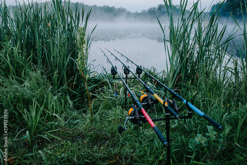 © Serhii, Naklejka premium Three carp fishing rods in rod pod on a background of lake and nature. Fishing background. Carp fishing. Misty morning. Holder rods. wilderness area. Signaling devices.