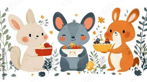 Naklejka premium Three Cartoon Animals Holding Desserts in a Floral Setting