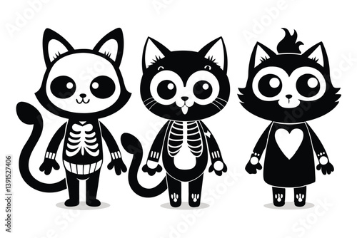 Obraz premium Three Cartoon Cats One Skeleton, One Heart, One Flame. Bold Black Silhouettes