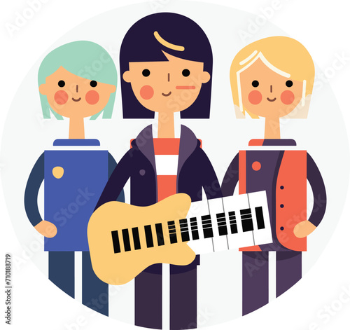 © Vectorvstocker, Naklejka premium Three cartoon characters are playing music together in a vector illustration.