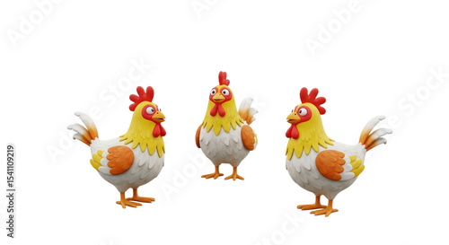© ndhtr, Fototapeta premium Three Cartoon Chicken Figurines with Bright Colors and Playful Expressions on White Background