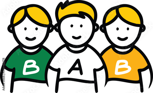 © Lucky-94, Naklejka premium Three cartoon children with yellow hair and letters on shirts green shirt white letter B