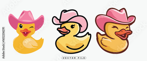 © Divine123victory, Naklejka premium Three cartoon ducks wearing pink cowboy hats in different styles and expressions