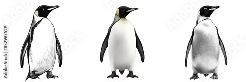 © Purichaya, Obraz premium Three cartoon emperor penguins in a row, presenting a front, side, and back view. Isolated on a white background.